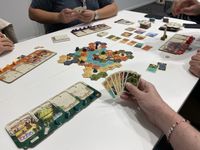 Dewan plays like an archetypal Eurogame. Each turn, you take one of two actions — and you can't take one of the actions without first doing a bunch of the other action, Ticket to Ride style. You compete (modestly) for cards in the draft, but you also compete (fiercely) for spaces in the playing area since those spaces are limited. You're pushed to place a camp so that you can grab the story tile that fits with what you're already doing, and when possible you grab spaces that others will travel through since you get to keep the card they spend to cross that space.