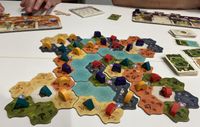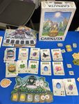 Each player represents a tribe trying to claim area in a shared terrain, specifically area on story cards that you draft over the course of play. On a turn, you either draft two adjacent terrain cards from a six-card river or play cards to place your next camp on the board.