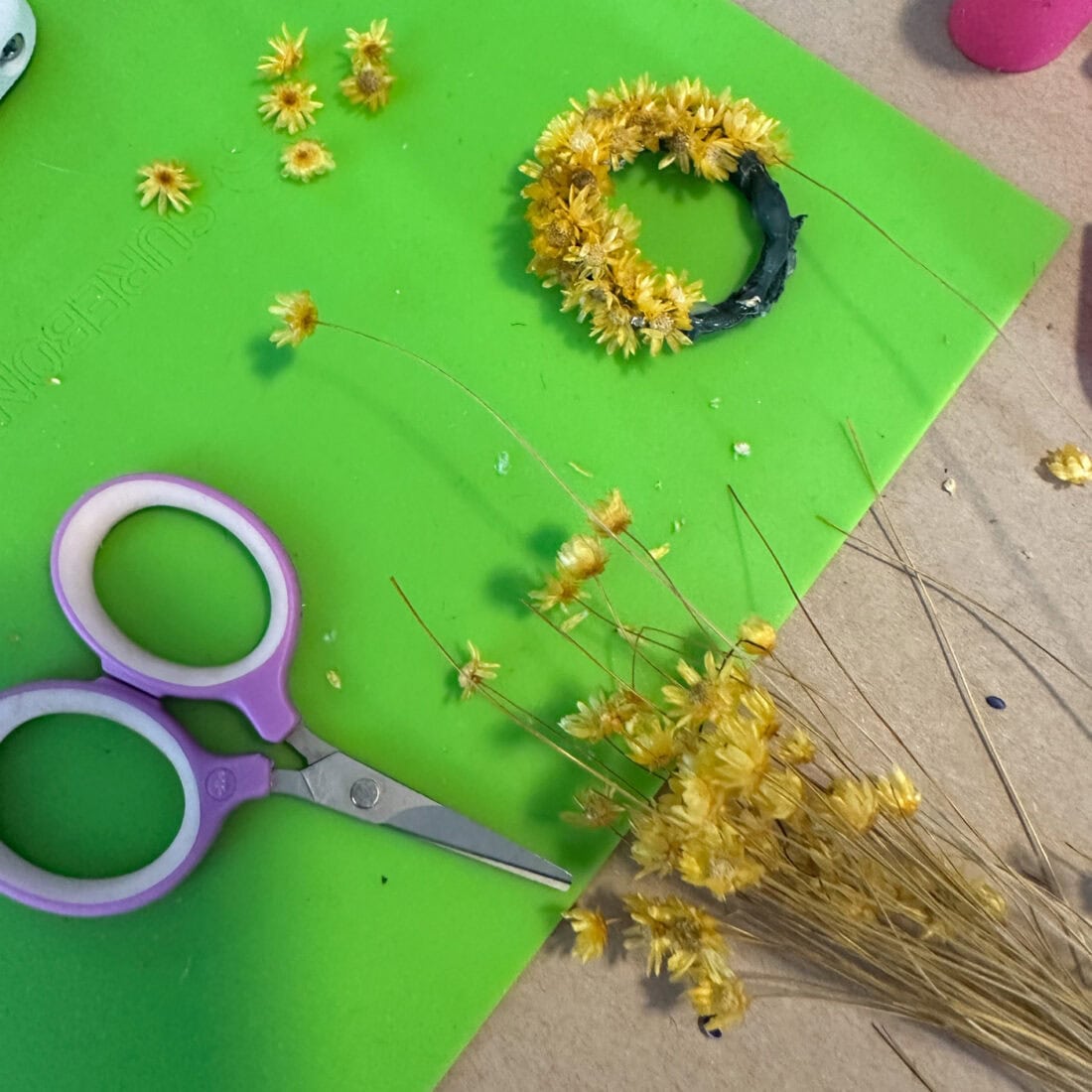 Here’s a couple photos of the bare birdhouse and the tiny flowers I used to assemble the little wreath on the front door. The rest of the process was just gluing things in place. I did use the leaves of a dried eucalyptus plant for the roof shingles.