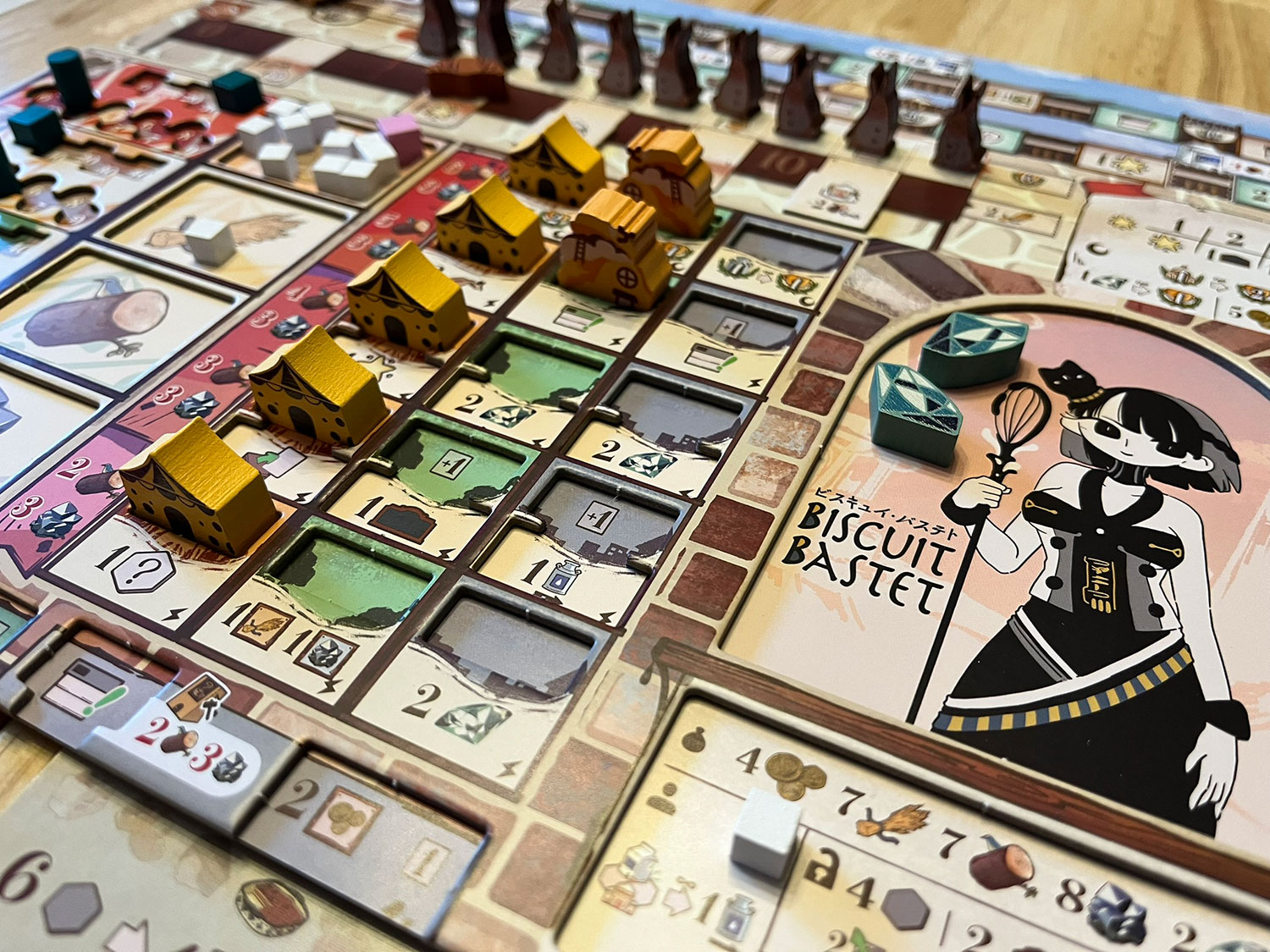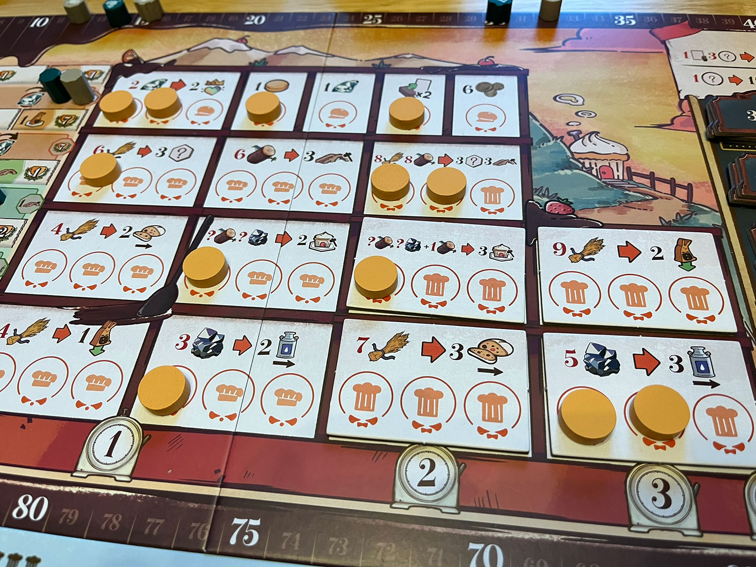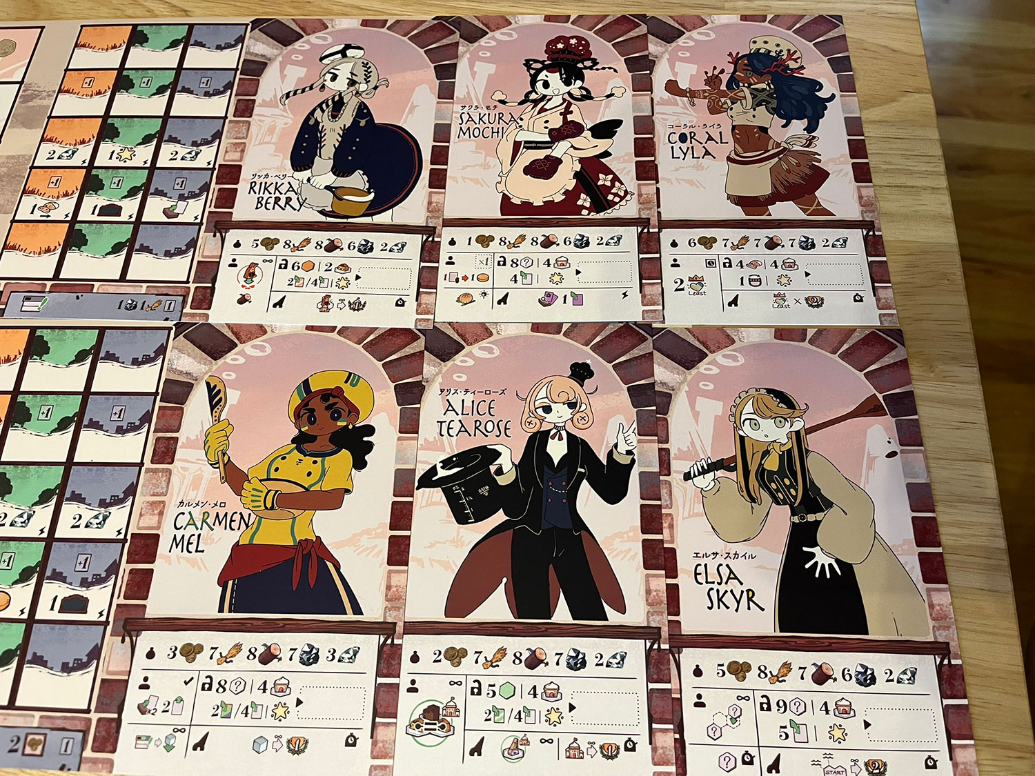 An individual dual-layer playerboard, shown at end-game. This player went all-in on brownie buildings (they’re gone), whereas only a few cream puff houses, and zero cheese tents were constructed.This is the type of game where you cannot do everything. Much of the big scoring comes from the end of certain tracks, so you’ll want to specialize in certain areas and max them out. Specialization will largely be dictated by the character you play; there are 14 different options, each with unique and powerful capabilities that you’ll really want to lean into. The deck of 207 unique cards, 6 possible variants of personal map board layouts, and 5-7 various pairings of aid tiles to draft each round (among 25 total options) will dictate your options for executing various strategies. Altogether, these and several additional game elements combine for fairly decent replayability.