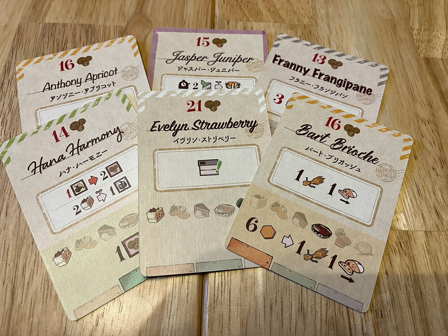 Each card features a different set of sweets tags, recipe names, and unique one-time and/or repeat abilities.The card variability among 207 options is both exciting and sometimes frustrating. Each card is classified into one, none, or all three industry types, which may matter for various player objectives. In addition to industry type, each card will have one or more types of 6 possible sweets tags. Finally, the cost to play cards varies from 4 to 26 coins, with rewards usually proportional to the cost. Early game, playing a 20+ coin card is likely prohibitively expensive. Many of the higher-cost cards also require specific sweet tags that players may or may not have (even by late game) to maximize their value. Thus, the value of the various cards is highly dependent on the round of the game as well as the state of play of the individual players. The rulebook suggests drafting opening hands as a variant, though I feel this should be standard practice after your first game. I would even recommend drafting your new 5 cards at the beginning of each subsequent round as well, since this helps minimize the luck factor across the huge deck in a game of limited overall card draw.