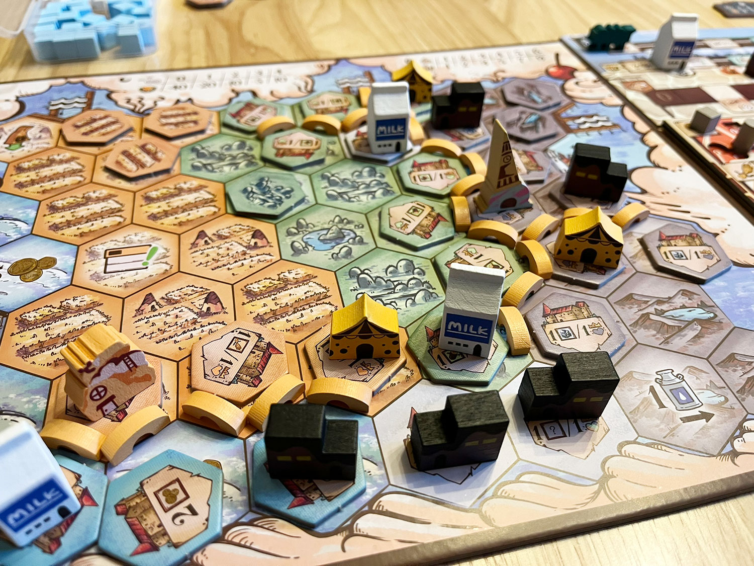 An example of an individual playerboard at end-game, filled with brownie buildings, cheese tents, and milk-research labs comprising a total of four unique cities.Game Experience:
