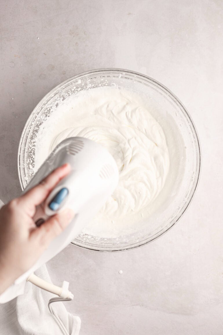 - Beat: Add the whipping cream to a mixing bowl and beat until stiff peaks form.