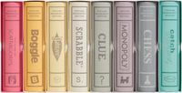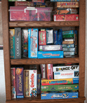 What about games make them look awkward on a shelf? I think it's because they lack most of the book-y properties above. Game boxes are less at home vertically; boxes always seem to be at risk of separating and spilling out their contents. Card games in particular are often too thin to even stand up on their own. Games are also extremely un-uniform in size, creating weird shapes and unfillable gaps.
